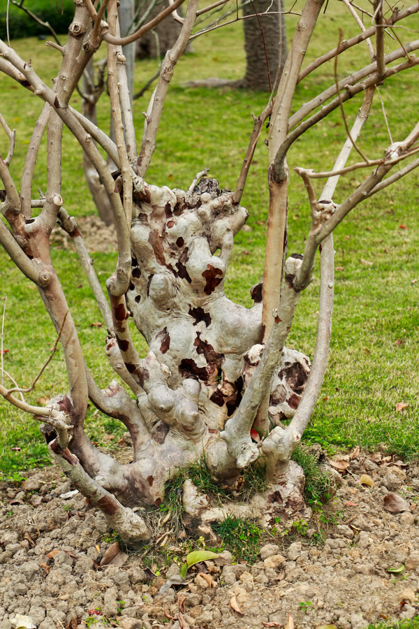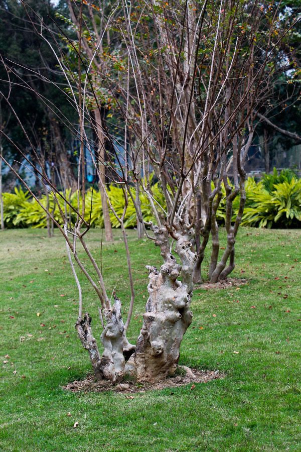 主干分层型:这种树型主干主枝明显,侧枝均匀的分布在主干上,可采用蓄枝截干法培养。苗木移栽培育时,在苗木高度1.0米处截枝定干,待苗木发芽后,生长5-10厘米时,选留1个顶芽、3-5个侧芽,其余全部抺除。保留的侧枝长到30厘米左右时,长度保持在10厘米左右时进行短截,留下的1个顶芽长到30厘米左右时,在长度10厘米处短截,培育第二层。此树形符合紫薇的自然发育规律,树高冠大,适宜庭院孤植或行植观赏。