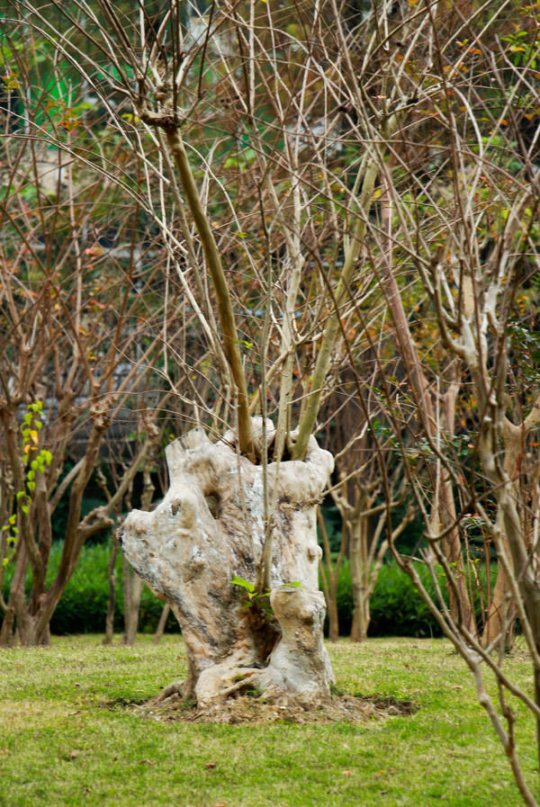 独干式:这种树型主干主枝明显,侧枝均匀的分布在主干上,可采用蓄枝截干法培养。苗木移栽培育时,在苗木高度1.5米处定干,待苗木发芽后,生长5-10厘米时,选留3-5个侧芽,其余芽全部抺除。保留的侧枝长到30厘米左右时,长度保持在10厘米左右时进行短截蓄枝。尔后结合每年冬季修剪,重剪当年生新枝,保留长度为5-10厘米,逐渐培养树冠分枝为鸡爪状,可保持优美的树形树冠。